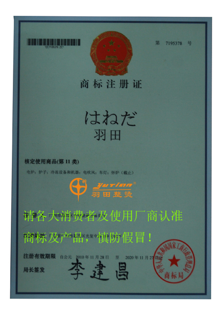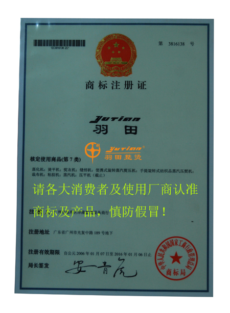 以下為我司的商標(biāo)注冊證書,請各大消費(fèi)者、使用廠商及經(jīng)銷代理商認(rèn)準(zhǔn)我“羽田”牌制衣整燙設(shè)備的商標(biāo)及產(chǎn)品: