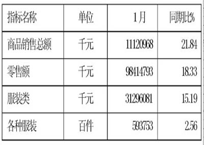 零售量方面,1月份各類服裝零售量實現(xiàn)同比增長2.56%,表現(xiàn)較為突出的是男西裝、男襯衫、夾克衫、女裝、牛仔服、運(yùn)動服和皮革服裝,同比增速均在5%以上。與去年同期相比,服裝零售量同比增速放緩25.46%,與2009年同期相比,放緩28.73%。