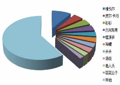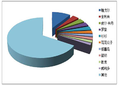 前十位品牌市場綜合占有率均低于10%,其中雅戈爾以9.83%的市場綜合占有率位居榜首,皮爾·卡丹位居第二,市場綜合占有率為5.08%,第三位以后品牌占有率均不到5%,競爭比較激烈,第十位品牌花花公子的市場綜合占有率為1.82%,與榜首品牌的差距為8.01個百分點(diǎn)。