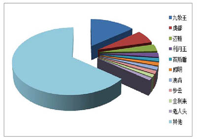 2012年1月份褲子市場前十位品牌市場占有率達(dá)到35.44%,比上月提高1.52%,但比去年同期低3.04%。與上月相比,前四位品牌無變化,九牧王仍以領(lǐng)先優(yōu)勢位居第一,虎都、邁雅、利丹王位居第二到第四位。后六位品牌市場綜合占有率較低,低于2%,差距也十分小,競爭比較激烈。