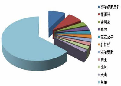 1月份羊毛衫市場排名前十位品牌中,鄂爾多斯奧群、恒源祥占據(jù)榜單前兩位,綜合占有率分別為8.87%和7.90%,遠(yuǎn)遠(yuǎn)高于后八位品牌的占有率。除排名第三的金利來市場綜合占有率為3.2%,第四到第十的品牌市場綜合占有率相差不大,均未超過3%。