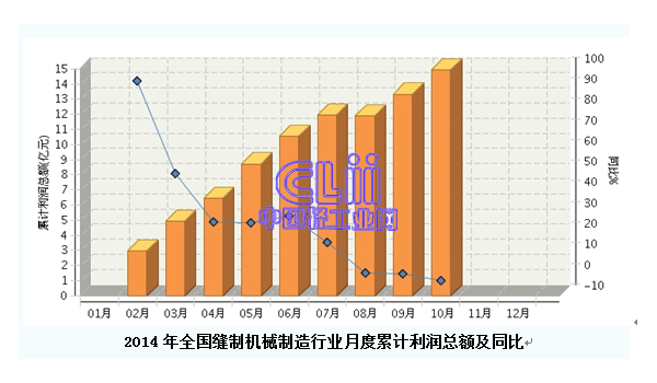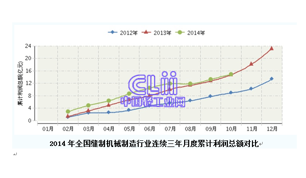 2014年1月~10月,全國(guó)縫制機(jī)械制造行業(yè)累計(jì)完成利潤(rùn)總額14.94億元,同比增長(zhǎng)-2.53%。前十個(gè)月份,利潤(rùn)增速持續(xù)下滑,10月累計(jì)利潤(rùn)總額14.94億元,同比增長(zhǎng)-2.53%。