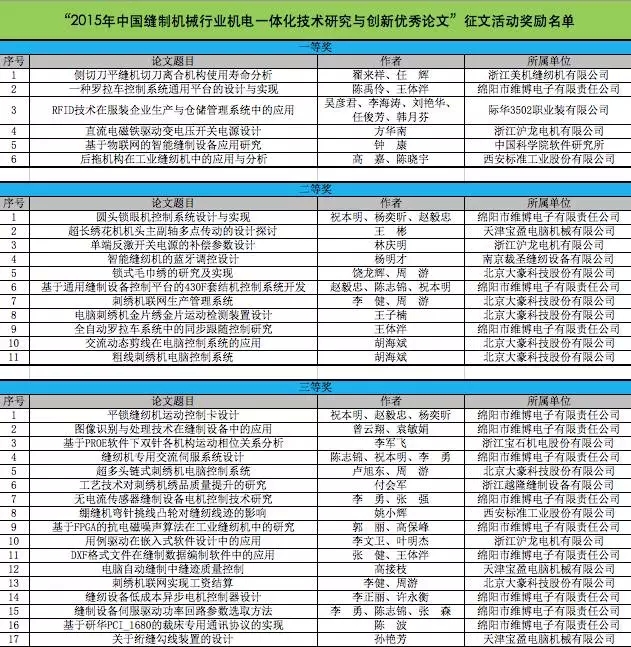 本次活動共征集有效論文43篇,經(jīng)活動專家組認(rèn)真評選,最終評選出一等獎6篇,二等獎11篇,三等獎17篇。本次征文活動頒獎儀式已于7月3日與全國工業(yè)機械電氣系統(tǒng)標(biāo)準(zhǔn)化委員會縫制機械電氣系統(tǒng)分標(biāo)委會成立大會暨協(xié)會電控專委會2015年年會在上海同期舉行。協(xié)會理事長何燁、副理事長林建龍分別為獲獎代表頒發(fā)了榮譽證書及獎金。