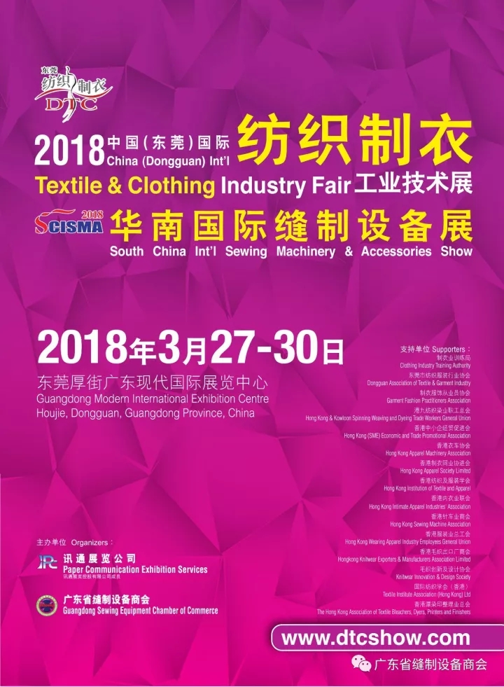 由廣東省縫制設(shè)備商會(huì)、訊通展覽公司聯(lián)合主辦的第十三屆華南國際縫制設(shè)備展覽會(huì)(SCISMA 2018)暨第十九屆中國東莞國際紡織制衣工業(yè)技術(shù)展(DTC)將于2018年3月27-30日在廣東東莞厚街•廣東現(xiàn)代國際展覽中心舉行,F(xiàn)已有業(yè)內(nèi)各著名廠商踴躍報(bào)名參展,本次展出來自中國及香港臺(tái)灣地區(qū)、日本、印度、德國、韓國、意大利、美國及瑞士等國家的頂尖技術(shù)及生產(chǎn)設(shè)備。