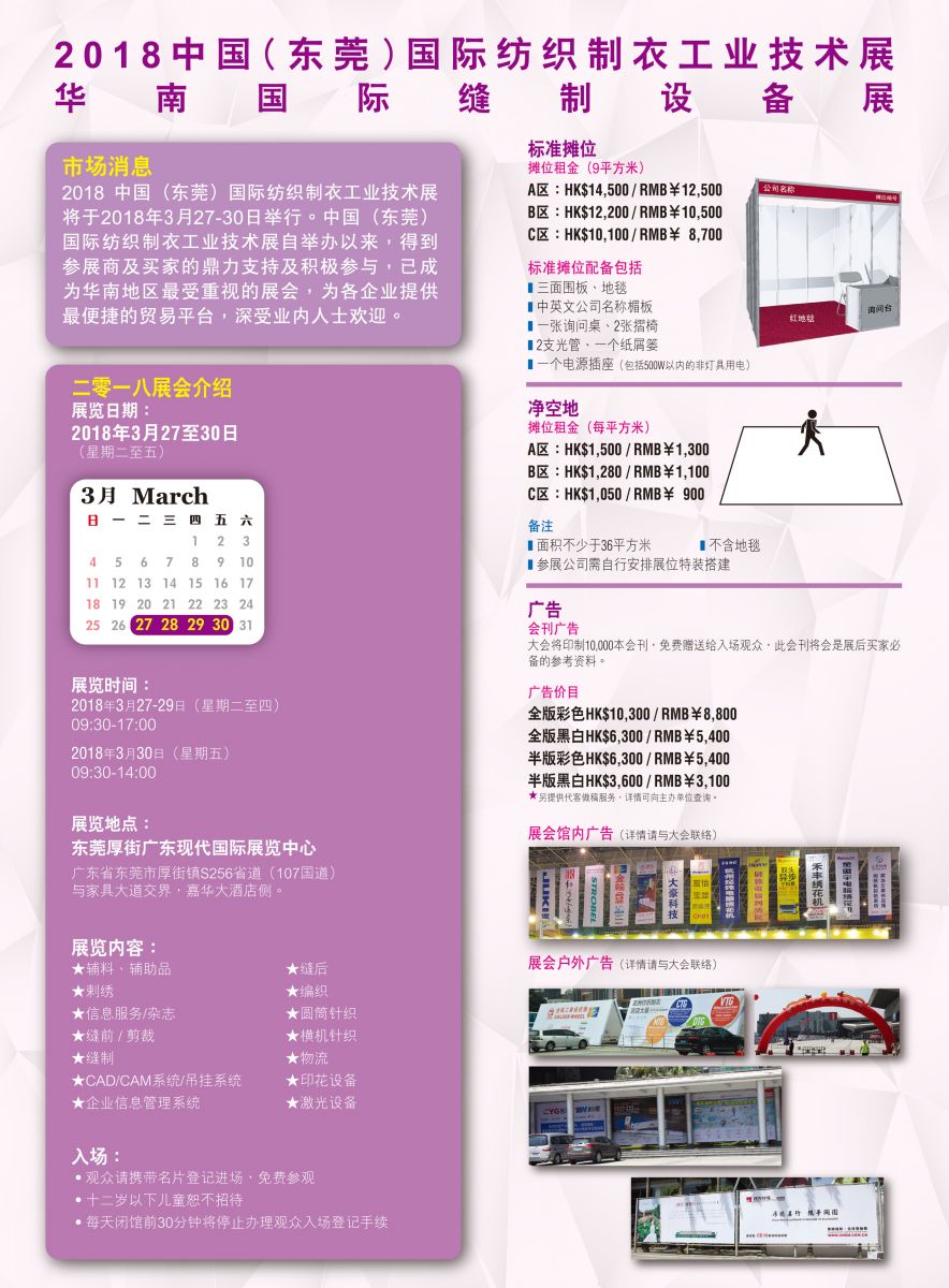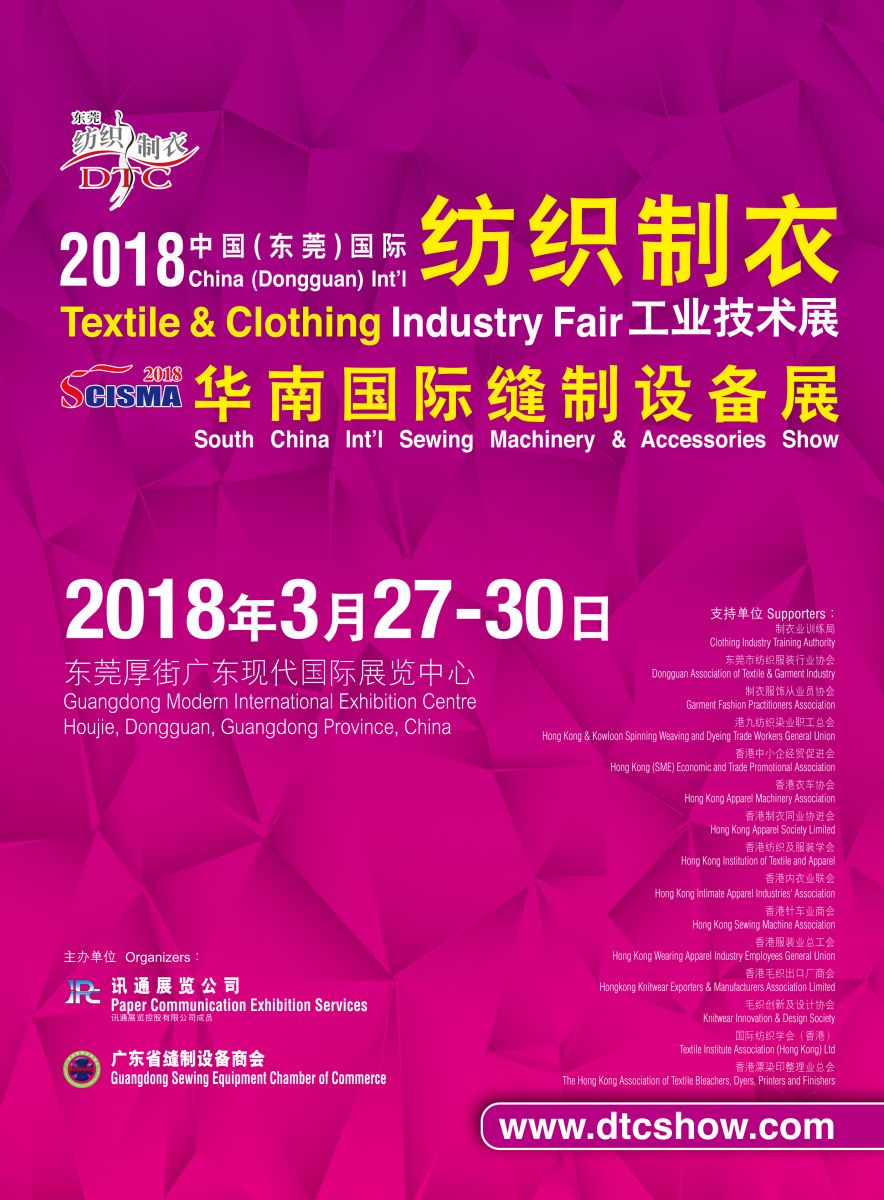 3月27-30日,由廣東省縫制設備商會、香港訊通展覽公司聯(lián)合舉辦的第十三屆華南國際縫制設備展暨第十九屆中國東莞國際紡織制衣工業(yè)技術展將在東莞厚街廣東現(xiàn)代展覽中心隆重舉行。