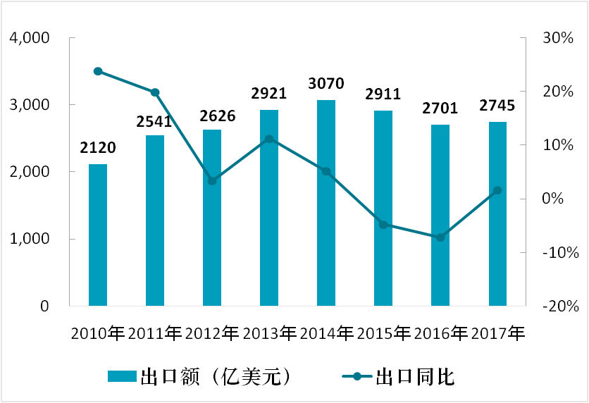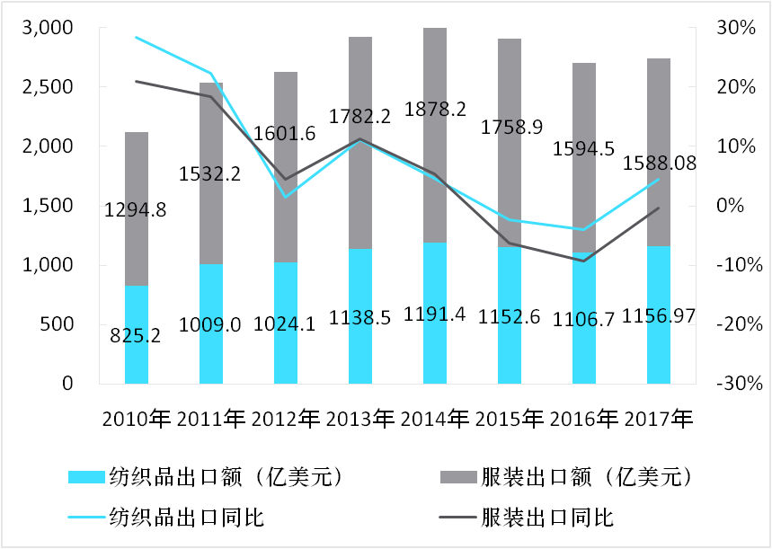 2010-2017年中國紡織品服裝對外貿(mào)易情況
