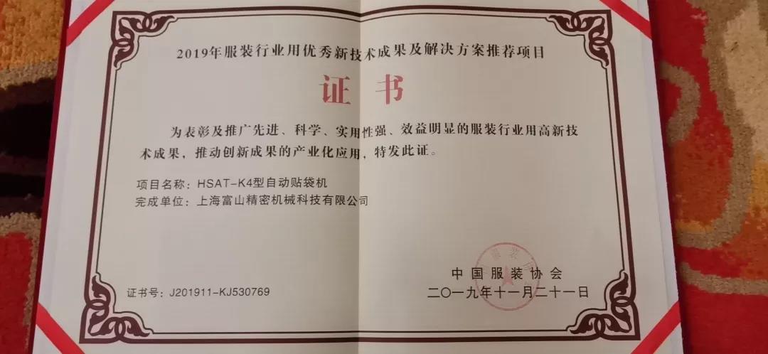 第五屆中國服裝科技發(fā)展會(huì)議盛大召開!富山榮獲2019年服裝行業(yè)用優(yōu)秀新技術(shù)成果及解決方案推薦項(xiàng)目榮譽(yù)證書!