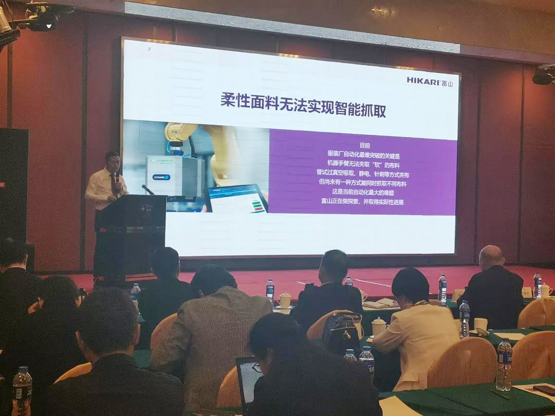 作為此次會(huì)議協(xié)辦單位,富山公司代表人受邀上臺(tái)作了“先進(jìn)服裝制造設(shè)備前沿技術(shù)的探索”主題演講。
