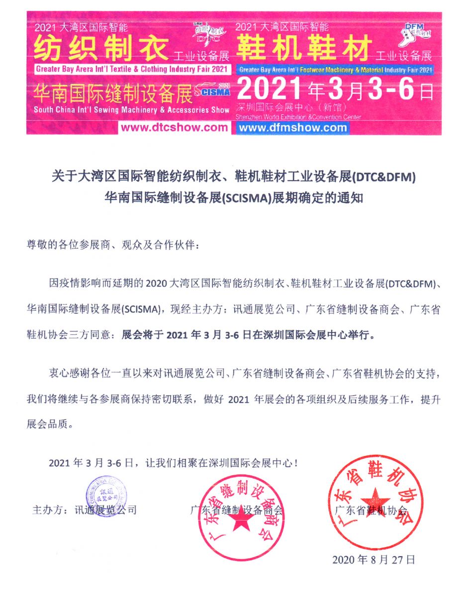 因疫情影響而延期的大灣區(qū)國(guó)際智能紡織制衣工業(yè)設(shè)備展DTC、華南國(guó)際縫制設(shè)備展SCISMA、鞋機(jī)鞋材工業(yè)設(shè)備展DFM,現(xiàn)經(jīng)主辦方:訊通展覽公司、廣東省縫制設(shè)備商會(huì)、廣東省鞋機(jī)協(xié)會(huì)三方同意:展會(huì)定于2021 年3月3-6日在深圳國(guó)際會(huì)展中心舉行。