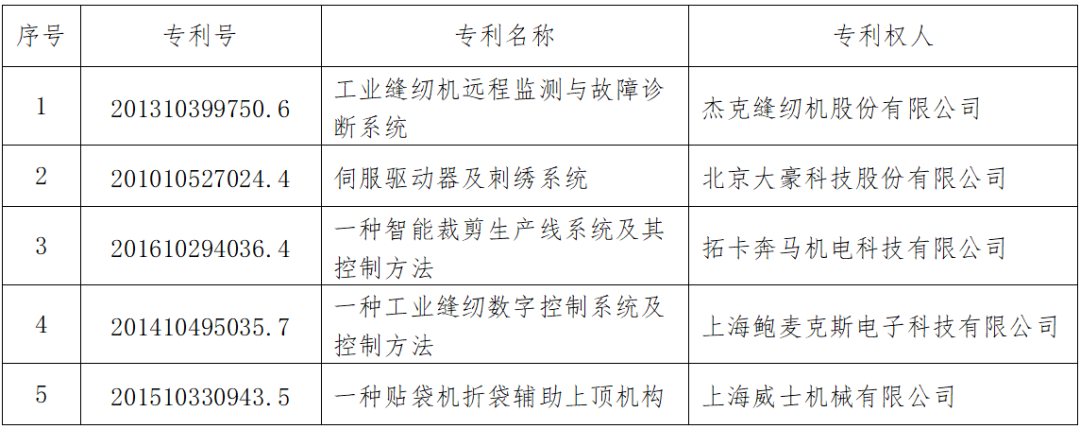 近日,國(guó)家知識(shí)產(chǎn)權(quán)局發(fā)布第二十一屆中國(guó)專利獎(jiǎng)授獎(jiǎng)決定,其中縫制機(jī)械領(lǐng)域共5個(gè)項(xiàng)目榮獲中國(guó)專利優(yōu)秀獎(jiǎng),名單如下: