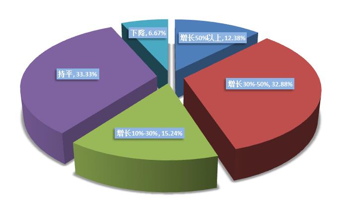 據(jù)統(tǒng)計(jì),受訪(fǎng)企業(yè)中一季度營(yíng)業(yè)收增長(zhǎng)50%的占12.38%,增長(zhǎng)30%-50%的企業(yè)占32.88%,增長(zhǎng)10-30%的企業(yè)占15.24%,營(yíng)收持平的企業(yè)占33.33%。
