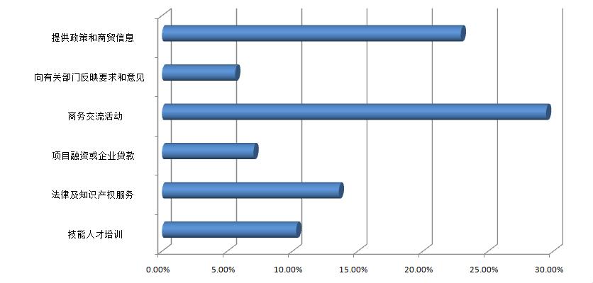 據(jù)本次調(diào)研顯示,受訪(fǎng)會(huì)員企業(yè)對(duì)商會(huì)服務(wù)工作的方向主要還是集中在組織商會(huì)交流活動(dòng)、提供政策和商貿(mào)信息、法律及知識(shí)產(chǎn)權(quán)服務(wù)等方面。