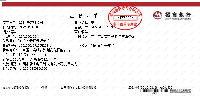 商會理事單位廣州市新靂電子科技有限公司向河南省紅十字會捐款十萬元,用于抗洪救災(zāi)。為河南抗洪救災(zāi)伸出援手奉獻愛心,為受災(zāi)群眾恢復(fù)正常生產(chǎn)生活、重建家園貢獻力量。
