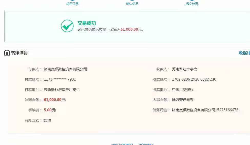 商會會員單位奧鐳數(shù)控設(shè)備有限公司通過河南省紅十字會向河南災(zāi)區(qū)捐款61000元。奧鐳數(shù)控公司的工作人員表示,這是公司所有人員的一份愛心,盡一份綿薄之力,愿河南早日渡過難關(guān),恢復(fù)重建!
