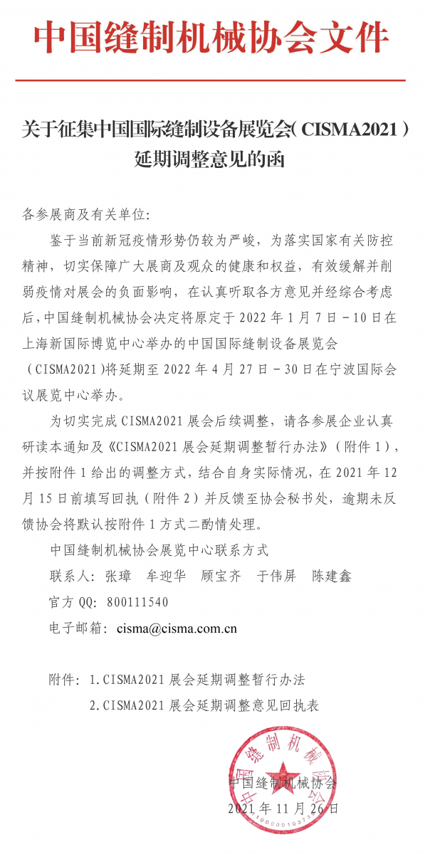 鑒于當(dāng)前新冠疫情形勢(shì)仍較為嚴(yán)峻,為落實(shí)國家有關(guān)防控精神,切實(shí)保障廣大展商及觀眾的健康和權(quán)益,有效緩解并削弱疫情對(duì)展會(huì)的負(fù)面影響,在認(rèn)真聽取各方意見并經(jīng)綜合考慮后,主辦方?jīng)Q定:原定于2022年1月7日-10日在上海新國際博覽中心舉辦的中國國際縫制設(shè)備展覽會(huì)(CISMA2021)將延期至2022年4月27日-30日在寧波國際會(huì)議展覽中心舉辦。