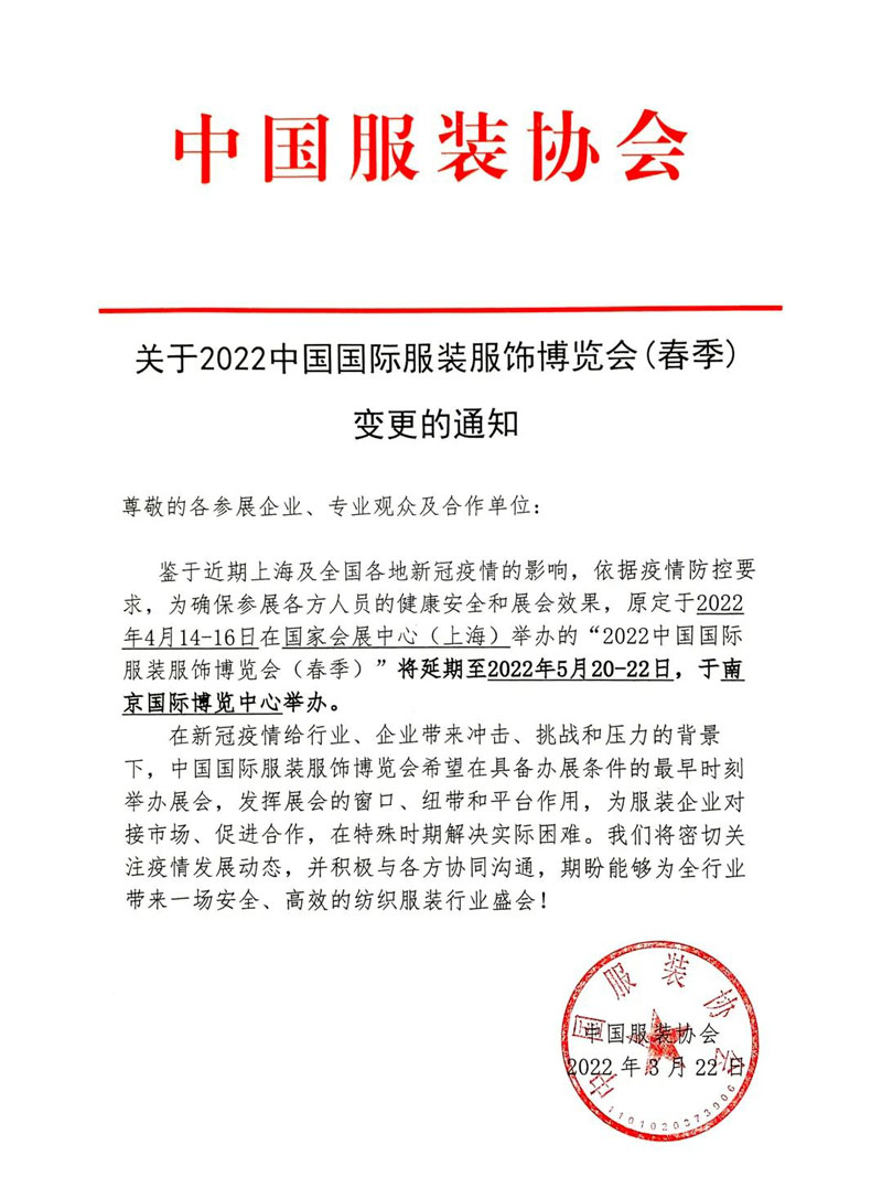 關(guān)于2022中國國際服裝服飾博覽會(春季)變更的通知