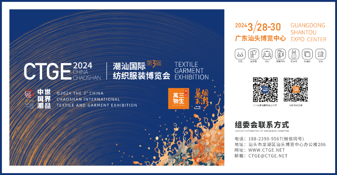 2024年第三屆CTGE潮汕國際紡織服裝博覽會的開展,是產(chǎn)業(yè)集群助推器,是鼓勵大潮涌動的進行曲。本屆服博會將全國紡織服裝產(chǎn)業(yè)集群匯聚潮汕,共同引領(lǐng)行業(yè)風(fēng)向標(biāo)和技術(shù)水平,共創(chuàng)紡織服裝產(chǎn)業(yè)巔峰盛宴!