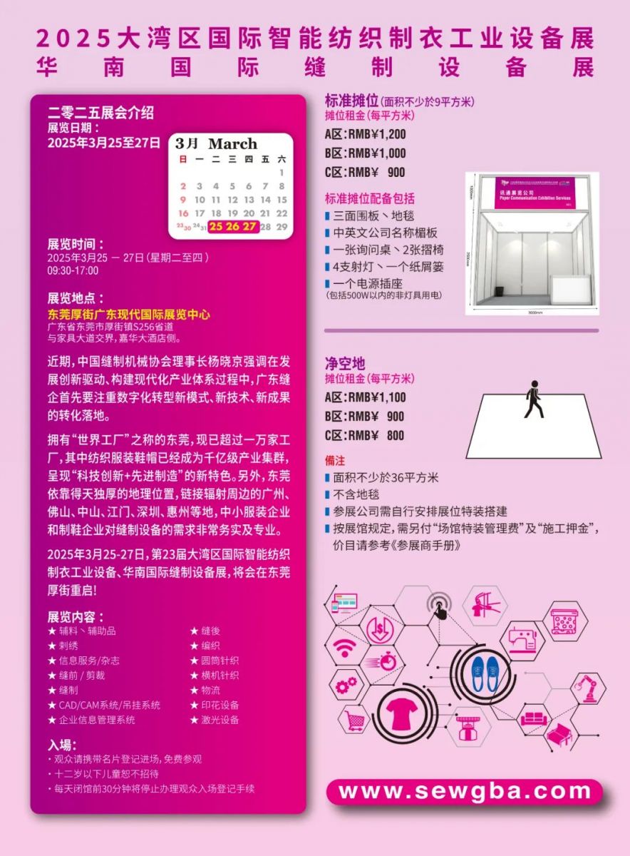 2025年大灣區(qū)制衣制鞋/縫制設(shè)備展集中展示國內(nèi)外先進(jìn)的服裝、鞋履與箱包生產(chǎn)設(shè)備,包括縫紉設(shè)備、編織機(jī)械、繡花及激光設(shè)備、超聲波設(shè)備、數(shù)碼印花設(shè)備、整熨包裝、鞋機(jī)鞋材、自動(dòng)化生產(chǎn)線、軟件系統(tǒng)技術(shù)及功能零部件等,為企業(yè)提供一站式生產(chǎn)采購的智能化解決方案。展會(huì)期間,展商將帶來新產(chǎn)品發(fā)布,同期主辦計(jì)劃舉辦多場行業(yè)論壇和交流活動(dòng),邀請(qǐng)行業(yè)專家、學(xué)者以及企業(yè)家共同探討產(chǎn)業(yè)發(fā)展的“新質(zhì)生產(chǎn)力、人工智能”新趨勢(shì)、新機(jī)遇,積極促進(jìn)產(chǎn)業(yè)鏈上下游的合作,實(shí)現(xiàn)資源共享,推動(dòng)行業(yè)向智能化、高端化發(fā)展。