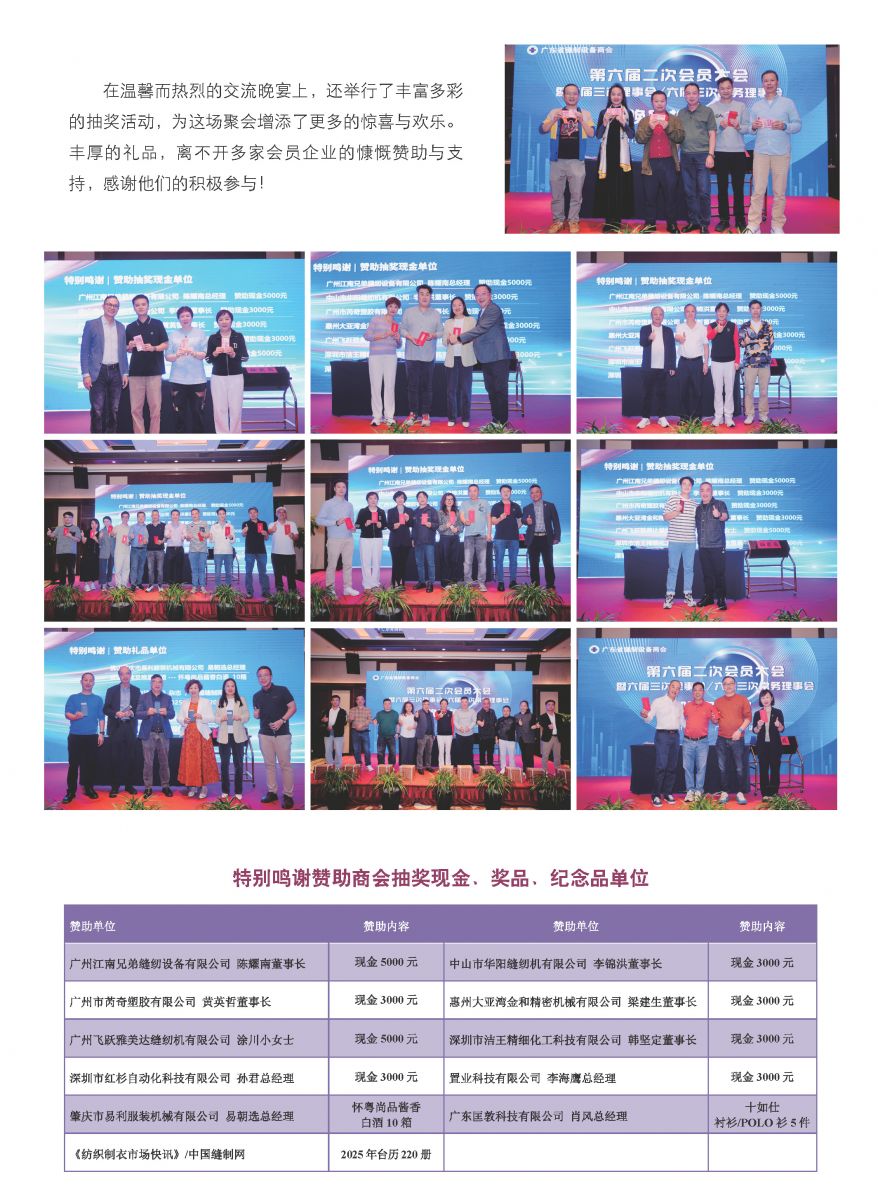 會議一致審議表決通過了以上報告及議案。大會同時聽取了2025大灣區(qū)暨華南國際縫制設備展SCISMA招展情況說明、2025中國國際縫制設備展覽會CISMA廣東組團情況說明、2024年“千會萬企”助力“百千萬工程”金融支持服務說明。