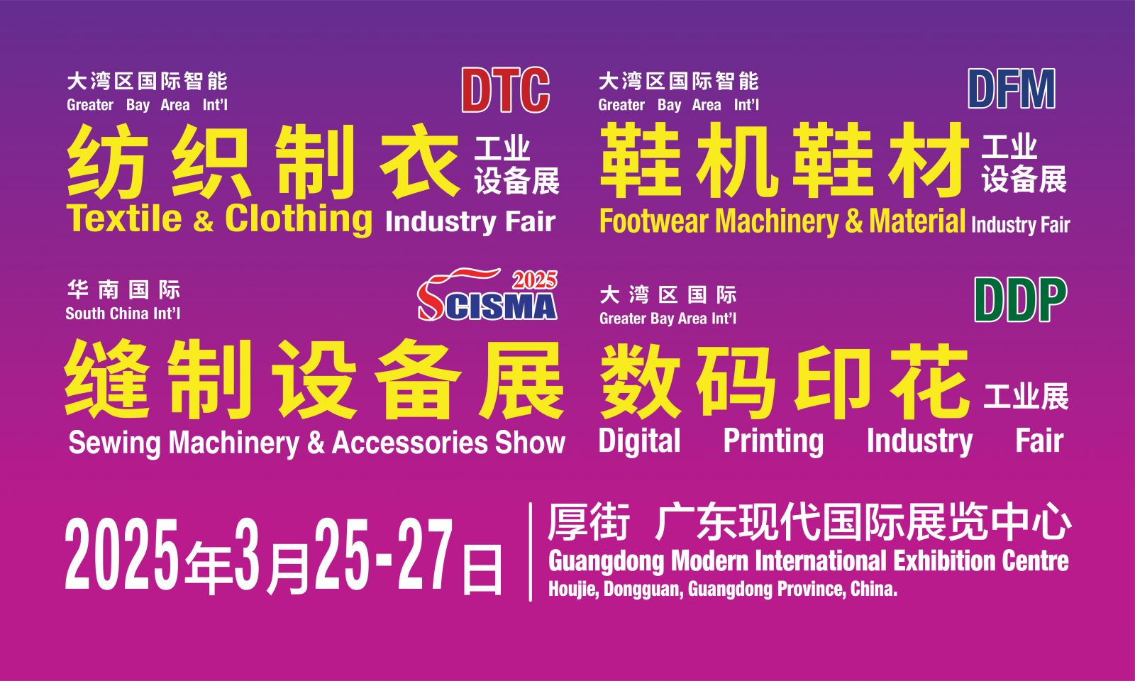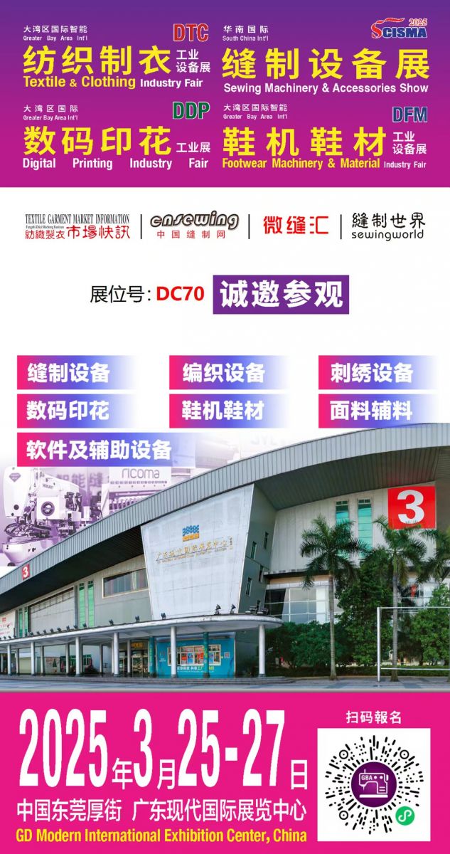 2025大灣區(qū)國際智能紡織制衣工業(yè)設(shè)備展、華南國際縫制設(shè)備展、國際智能鞋機(jī)鞋材工業(yè)設(shè)備展、國際數(shù)碼印花工業(yè)展,不僅是一場(chǎng)匯聚前沿科技與創(chuàng)新解決方案的盛會(huì),更是展商們展示實(shí)力、拓展市場(chǎng)的優(yōu)選平臺(tái)。我們誠摯地祝愿每一位參展商能夠借此契機(jī),充分展示各自領(lǐng)域的最新成果與卓越技術(shù),吸引來自全球的目光與合作意向,收獲滿滿的商機(jī)與合作伙伴。愿此次展會(huì)成為推動(dòng)產(chǎn)業(yè)升級(jí)、促進(jìn)商貿(mào)交流的重要橋梁,為參展商開啟無限可能的新篇章。期待2025年3月25-27日,我們東莞厚街現(xiàn)代展館見!