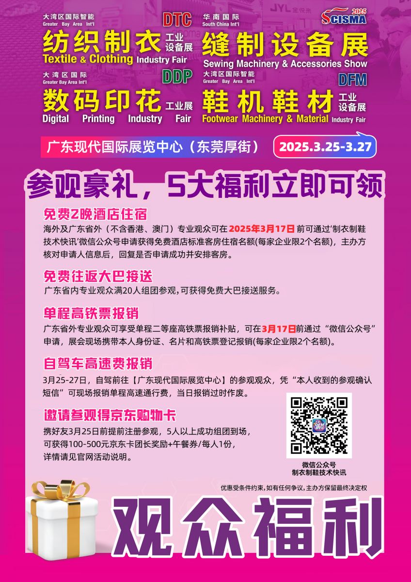 1)一站式生產(chǎn)采購:2025展會(huì)全新升級(jí),全面覆蓋服裝、家紡、鞋履、箱包、家具、汽車內(nèi)飾等生產(chǎn)環(huán)節(jié),為企業(yè)提供一站式生產(chǎn)采購的智能化解決方案。2)多品牌提供解決方案:2025開年行業(yè)首展,50000平米展覽面積,500+制衣,縫制,繡花,印花,編織,鞋機(jī)及新材料品牌集結(jié),展出降本增效新技術(shù)。3)展會(huì)品牌與地域優(yōu)勢(shì):【大灣區(qū)制衣制鞋-華南國際縫制設(shè)備展】2000年創(chuàng)立,立足大灣區(qū)耕耘25年,充分輻射東莞、廣州、惠州、中山等區(qū)域市場(chǎng)以及華南地區(qū)、東南亞國家市場(chǎng)(如孟加拉、越南等)保持著緊密的交流與合作;東莞厚街是中國重要的服裝、鞋履、箱包、家具產(chǎn)業(yè)基地之一,擁有完善的產(chǎn)業(yè)鏈和豐富的產(chǎn)業(yè)資源,展會(huì)展品與當(dāng)?shù)禺a(chǎn)業(yè)緊密結(jié)合,市場(chǎng)需求量大。