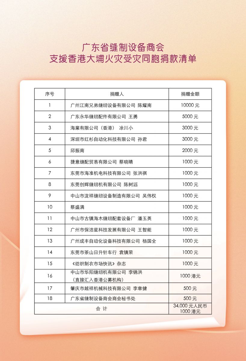 【聯(lián)合捐款倡議】廣東省縫制設(shè)備商會(huì)與香港衣車協(xié)會(huì)聯(lián)合發(fā)起支援香港大埔火災(zāi)受災(zāi)同胞的捐款倡議