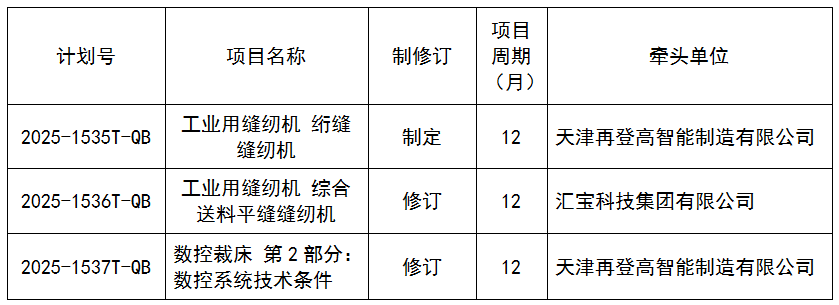 近日,工業(yè)和信息化部辦公廳正式印發(fā)《2025年第五批行業(yè)標(biāo)準(zhǔn)制修訂和外文版項(xiàng)目計(jì)劃的通知》(工信廳科函〔2025〕528號),由全國縫制機(jī)械標(biāo)準(zhǔn)化技術(shù)委員會(huì)報(bào)送的《工業(yè)用縫紉機(jī) 絎縫縫紉機(jī)》等3項(xiàng)行業(yè)標(biāo)準(zhǔn)正式批準(zhǔn)立項(xiàng),具體項(xiàng)目信息如下: