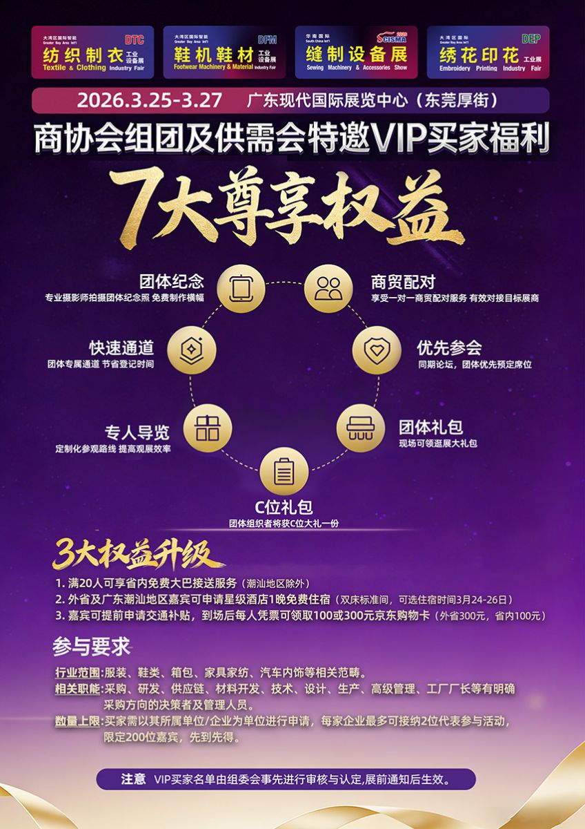 行業(yè)矚目的第25屆大灣區(qū)國際智能紡織制衣、鞋機鞋材工業(yè)設(shè)備展(2026DTC/DFM)、華南國際縫制設(shè)備展(SCISMA 2026)、大灣區(qū)國際繡花印花工業(yè)展(2026DEP)將于2026年3月25-27日在東莞厚街廣東現(xiàn)代國際展覽中心盛大啟幕。依托東莞制造業(yè)產(chǎn)業(yè)底蘊及粵港澳大灣區(qū)萬億級輕紡產(chǎn)業(yè)集群優(yōu)勢,展會以“新階段、新理念、新格局”與先進技術(shù)應用為核心,打造覆蓋紡織制衣、縫制設(shè)備、鞋機鞋材、繡花印花全產(chǎn)業(yè)鏈的展貿(mào)一體化平臺,精準對接廣東、廣西、福建、江西等核心產(chǎn)區(qū)買家,更輻射東盟/非洲/中東/中亞等海外重點市場,為企業(yè)搭建技術(shù)展示、商貿(mào)洽談、資源整合的頂級橋梁。
