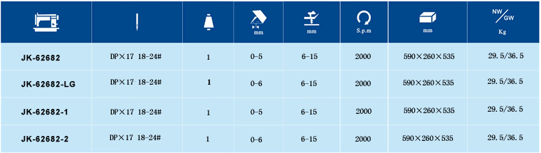 JK-62682系列是筒式單針綜合送料縫紉機(jī),采用滑桿挑線,連桿式送料機(jī)構(gòu),上下軸由高精度螺旋傘齒輪傳動(dòng),并采用自動(dòng)潤(rùn)滑合送料的方式更可防止縫料層之間的相對(duì)錯(cuò)移,保證線跡更加美觀、整齊。JK-62682及JK-62682-LG采用水平式下送料方式,適用于包邊縫紉。JK-62682-1及JK-62682-2采用橢圓式下送料方式,適用于普通縫紉。