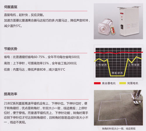 在外觀設(shè)計(jì)上,2180Z系列直驅(qū)高速平縫機(jī)擁有與三自動(dòng)電腦車(chē)完全相同的精美外觀。加入直驅(qū)馬達(dá)后,具有 省電、高效、低噪音等優(yōu)點(diǎn),減少二氧化碳排放,為服裝企業(yè)環(huán)保節(jié)能的首選產(chǎn)品。
