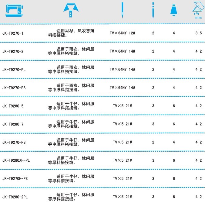 JK-T9270/9280高速曲腕機系列適用于襯衫、風(fēng)衣、牛仔裝、休閑裝等薄料、中厚料、厚料、服裝加工,其懸臂筒形的特殊結(jié)構(gòu)特別適合袖、褲等筒形部位的搭接縫紉。