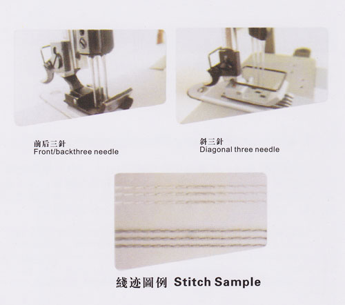該機(jī)造型穩(wěn)得美觀,操作空間大。采用針桿挑線(xiàn)、彎針勾線(xiàn),形成三針線(xiàn)跡,線(xiàn)跡美觀挺直,富有彈性,適用于不同縫線(xiàn)和面料的縫紉作業(yè),如中平布,卡其布和牛仔布料等,縫制效果好。并配備各種規(guī)格的尺寸針位產(chǎn)品可供選擇。