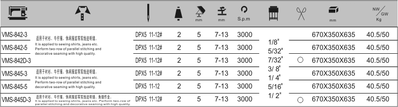 本機采用雙直針,立式自動加油旋梭勾線、滑桿挑線,構(gòu)成了二行雙線鎖式線跡。針桿采用機械式分離與聯(lián)合,上下軸用滾珠軸承支撐,同步齒形帶傳動,采用針桿擺動與送布牙同步送料方式,旋鈕式圓盤調(diào)節(jié)針距和杠桿式倒順?biāo)土蠙C構(gòu),在梭心內(nèi)的縫線回拉彈簧,保證底線與面線得到一致的縫紉效果,適用縫制襯衫、制服、牛仔褲、大衣或類似服裝。