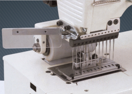 十二針平臺型勾針縱向環(huán)縫鏈式縫紉機上線為橡筋線,無下線。