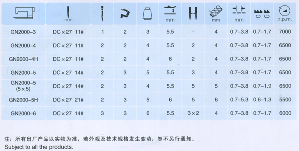 采用單直針,雙彎針構(gòu)成“504”或“505”線跡,適合各種紡織、針織面料的縫紉。有兩種規(guī)格可選擇,即三排齒和兩排齒,普通型為三排齒,包縫平穩(wěn),特別適合大面積的面料包邊;兩排齒三線包縫機使用了特殊短壓腳,有利于轉(zhuǎn)小彎作業(yè),加上專用的打折器可做T恤衫、文化衫暗縫卷邊作業(yè)。如果需要兩排齒,必須注明GN2000-3(兩排齒),或GN2000-3/2。