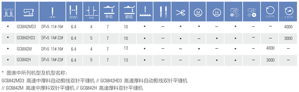 GC6842系列高速雙針平縫機(jī)該機(jī)采用微量循環(huán)供油,避免了對衣料的污染。機(jī)針與送布牙同步送料方式防止布料起皺與滑移,旋鈕式調(diào)節(jié)針距和杠桿式倒送料機(jī)構(gòu),操作方便。適用于縫制襯衫、內(nèi)衣、制服、牛仔衣褲、大衣等,線跡整齊美觀。針間距特殊規(guī)格:3.2/4.0/4.8/6.4/7.9/9.5/11.1/12.7/15.9/25.4/31.8/38.1mm
