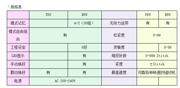 MC/E8U通過設(shè)定每段的松緊度及針數(shù),能自動(dòng)連續(xù)縫制八段不同工藝要求的工序。有26組模式記憶,每段有八段可供選擇的松緊度,而且模式之間可由適用者自由組合,以滿足多于八段工序的要求。制衣成品質(zhì)量穩(wěn)定,效果優(yōu)良。該機(jī)結(jié)構(gòu)合理,設(shè)計(jì)先進(jìn),造型美觀,操作方便,是內(nèi)衣生產(chǎn)廠家的優(yōu)選的高檔服裝設(shè)備
