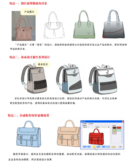 秀革箱包設計系統(tǒng)是專業(yè)的設計工具,填補了箱包產(chǎn)品開發(fā)工作中設計的信息化應用的空白,幫助企業(yè)在設計環(huán)節(jié)提高核心能力。