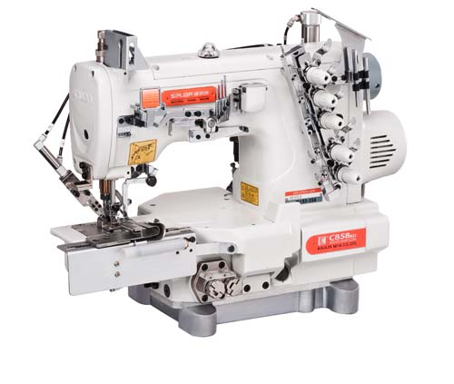 將環(huán)形羅紋松緊帶縫入原體,適用于男女內褲、褲腰之羅紋松緊帶包縫再配合自動切線裝置及筒型衣物撐開滾輪組,更能提高縫製效率 注 : 本機型標準配備二折式導布片,可另訂三折式導布片