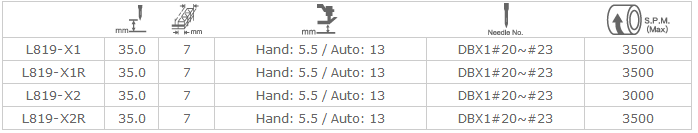 特厚料用高速單針平縫機(附自動切線裝置) 獨特的送布機構(gòu) 適用于厚布料,皮革制品,手提袋等,最大針距可達7mm。特殊設(shè)計送布機構(gòu),送布力強,厚料的迭縫也能暢通無阻的縫制 輪錢押具 (選配) L819-X1R & L819-X2R 配備輪錢押具,可依實際縫紉需要任意變換方向迭縫,皆能得到良好縫跡 旋轉(zhuǎn)式切刀 切線機構(gòu)采用旋轉(zhuǎn)式切刀,以細線至粗線皆有安定切線性能 尼龍押具 (選配) 配備尼龍押具,上送布牙不會造成布面損傷,縫制小圓角時,也能運轉(zhuǎn)自如