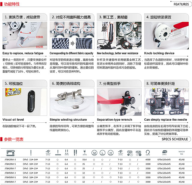 本機(jī)采用雙直針、立式微油旋梭勾線,滑桿挑線,構(gòu)成兩行雙線鎖式線跡。針桿采用機(jī)械式分離與聯(lián)合;上下軸用滾珠軸承支撐,同步齒形帶傳動;微油潤滑系統(tǒng)。采用針桿擺動與送布牙同步送料方式,旋鈕式圓盤調(diào)節(jié)針距和杠桿式倒順?biāo)土蠙C(jī)構(gòu),在梭芯內(nèi)的縫線回拉彈簧,保證底線與面線得到一致的縫紉效果,適用縫制大衣、制服、牛仔褲、包袋、裝飾縫等。