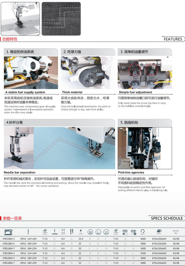 本機(jī)采用雙直針、立式自動(dòng)加油旋梭勾線,滑桿挑線,構(gòu)成二行雙線鎖式線跡。針桿采用機(jī)械式分離與聯(lián)合;上下軸用滾珠軸承支承,同步齒輪形帶傳動(dòng);柱塞式油泵潤(rùn)滑系統(tǒng)。采用針桿擺動(dòng)與送布牙同步送料方式,旋鈕式圓盤(pán)調(diào)節(jié)針距和杠桿式倒順?biāo)土蠙C(jī)構(gòu),在梭心內(nèi)的縫線回拉彈簧,保證底線與面線得到一致的縫紉效果,適用縫制大衣、制服、牛仔褲、包袋、裝飾縫等。