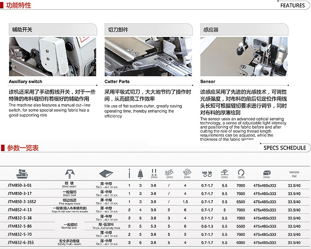 JTM800系列是改進(jìn)的基本型包縫機(jī),美麗的線跡和充實(shí)的附屬配件,維修方便,可廣泛滿足市場的需求;實(shí)現(xiàn)了控制溫度、噪聲、振動(dòng)的高速旋轉(zhuǎn),提高了生產(chǎn)效率;油封效果好,保護(hù)縫制品不受油污染。