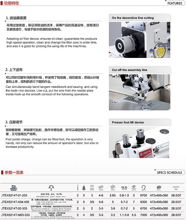 該機(jī)器廣泛適用于服裝、內(nèi)衣、床上用品及薄型包裝盒皮革制品等各種面料的搭接縫、裝飾縫。另外還有多種線(xiàn)跡可供選著,JETX5214系列采用的是上下送布可獨(dú)立運(yùn)作的新型送布機(jī)構(gòu),通過(guò)加大的差動(dòng)比和優(yōu)越的送布性能組合,可消除縫制錯(cuò)位,或者與其他面料一起縫制,使曲折、滾動(dòng)等難工序變得簡(jiǎn)單易行。