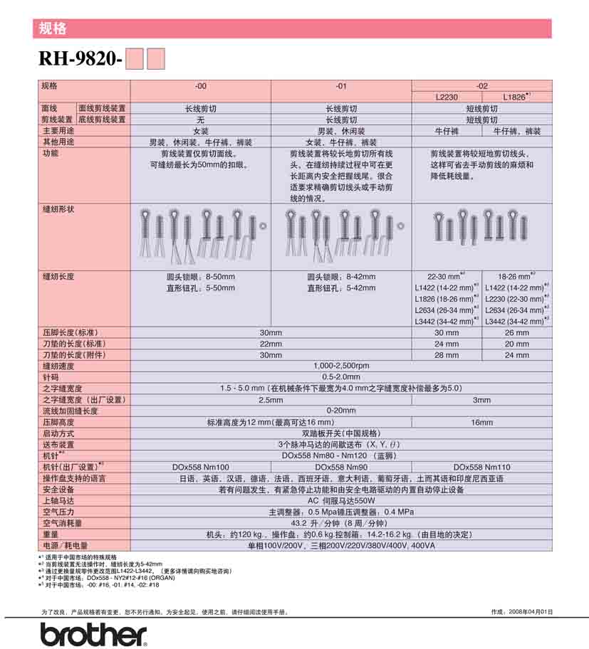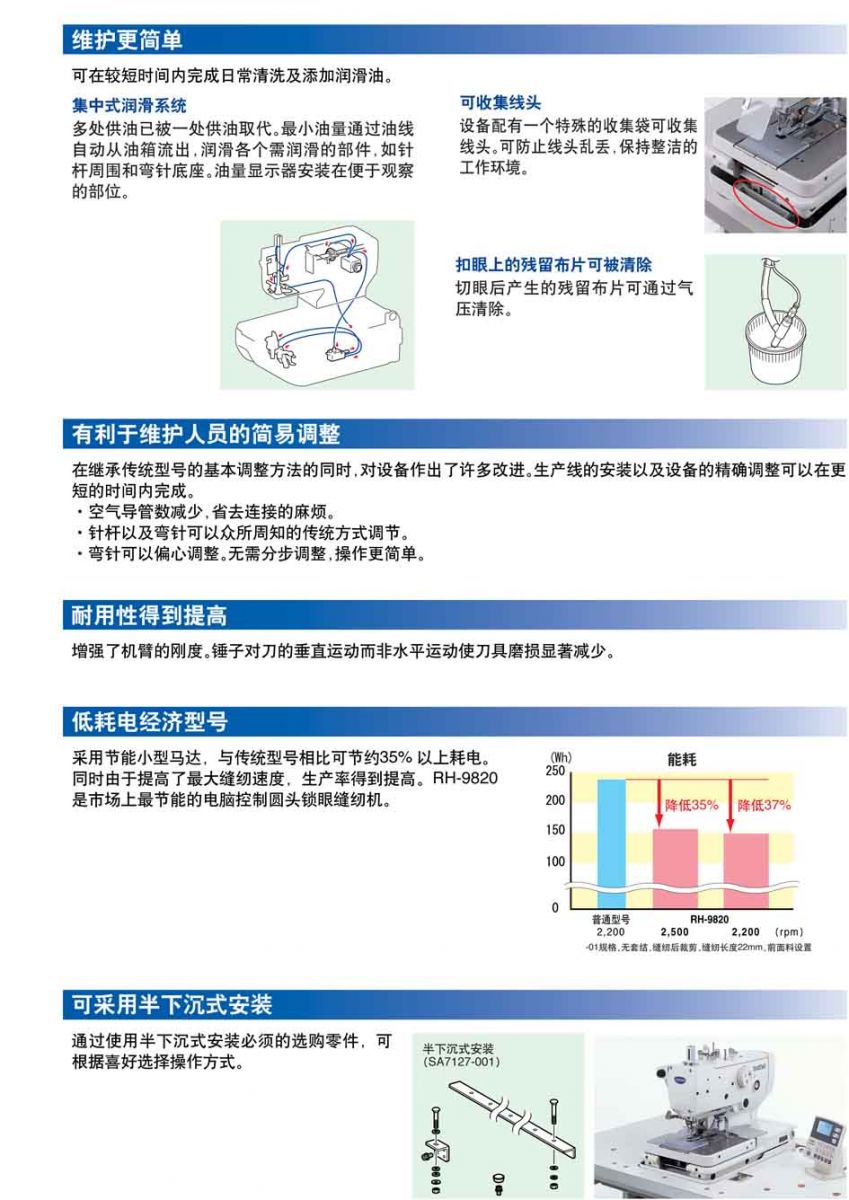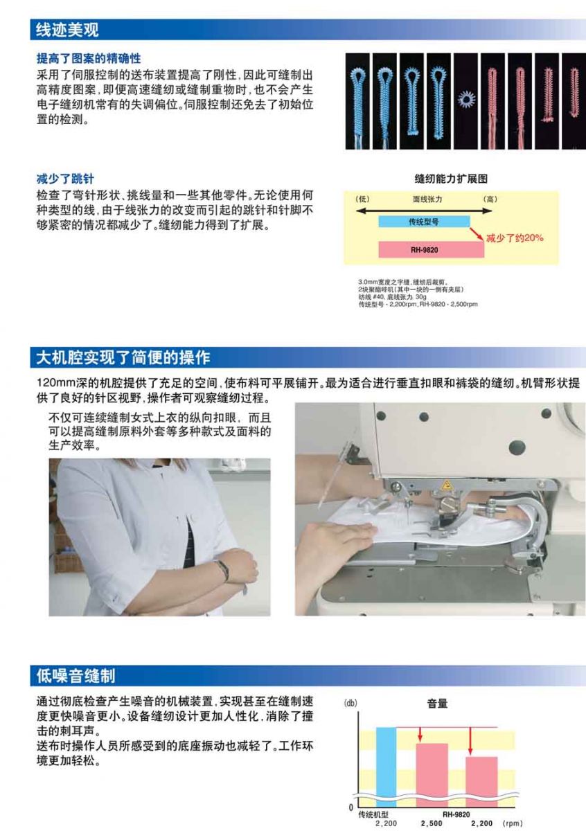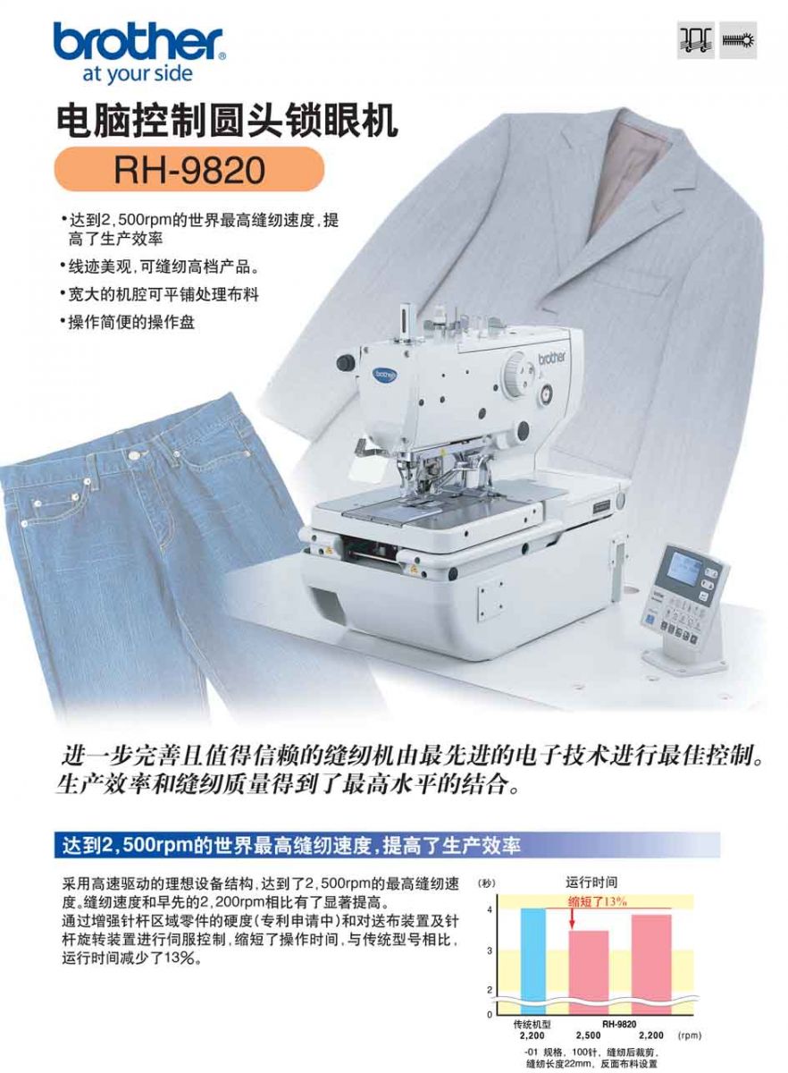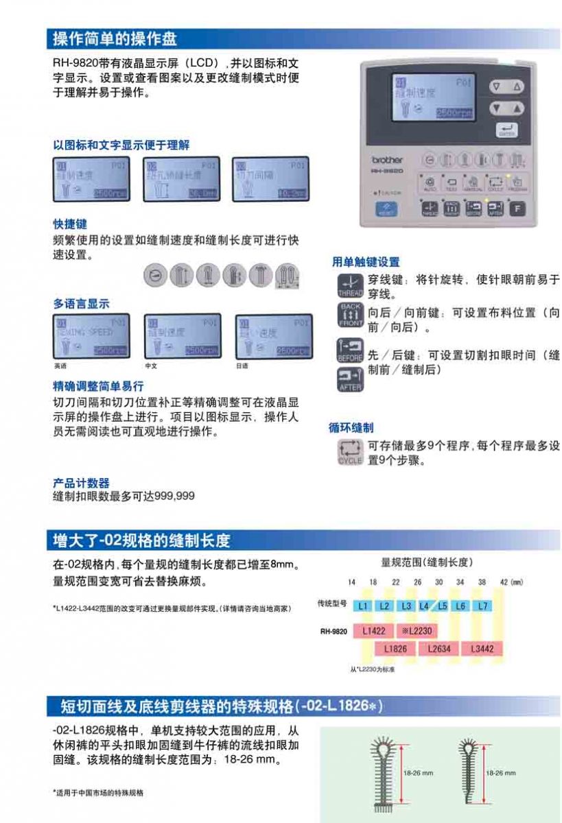 · 能鎖出美麗的扣眼,且線跡精致漂亮。 · 最高縫紉速度達2,500rmp,提高了生產(chǎn)效率。 · 機腔寬大,可放置寬大面料。 · 使用方便易懂的操作盤。 針距:0.5-2.0 mm 針的擺動幅度:1.5-5.0 mm 抬壓腳高度:12-16 mm 縫制長度:5-20 mm 尾結(jié)長度:0-20 mm 最高縫紉速度:2500 rpm 面線剪線裝置為標(biāo)準(zhǔn)裝備