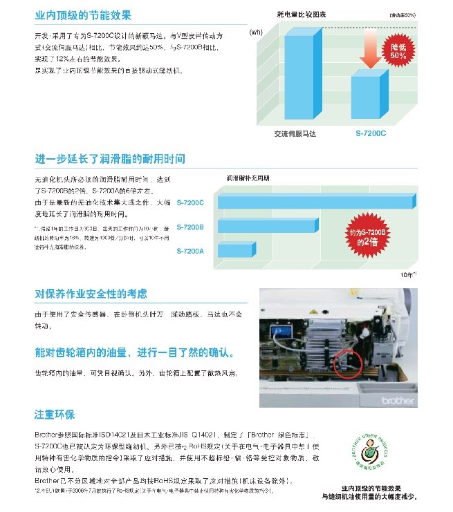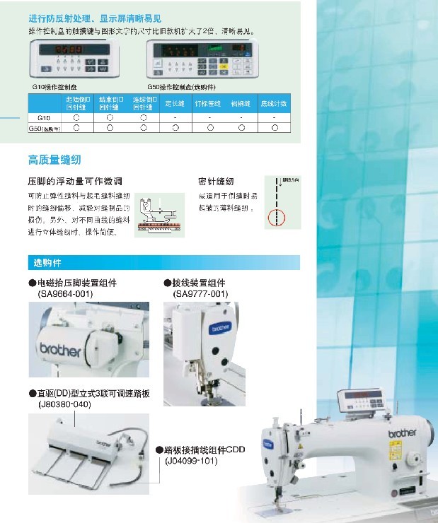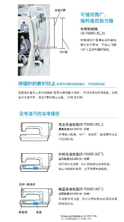 · 反應敏捷、縫紉舒適。 · 沒有油污的清潔縫紉。 · 簡單易懂、使用方便的操作控制盤。 · 噪音低、振動小、縫紉機操作舒適。 無油/針桿無油/微油 用于薄料和難縫面料/中厚面料/厚面料 最高縫紉速度:4,000-5,000 rpm 最大針距:4.2-5 mm 抬壓腳高度:6-16 mm
