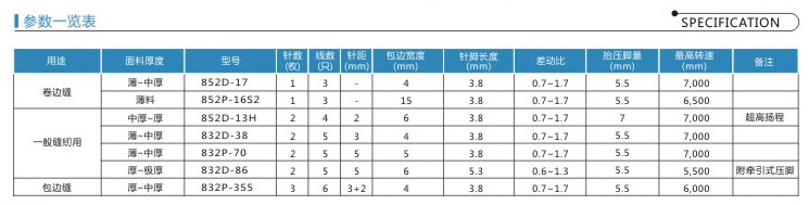 產(chǎn)品特點(diǎn):高速、低噪音、啟動(dòng)力矩。煌庥^漂亮、操作簡(jiǎn)易;線跡穩(wěn)定、美觀、理想、且調(diào)整方便。適用于褲子、睡衣、襯衫、運(yùn)動(dòng)服等包縫業(yè)。