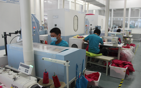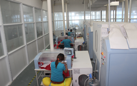 利用高壓氣體吸取羽絨,通過全自動稱重裝置,將設(shè)定克重的羽絨精準充入裁片。