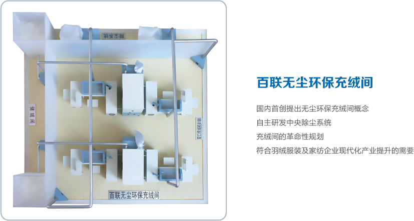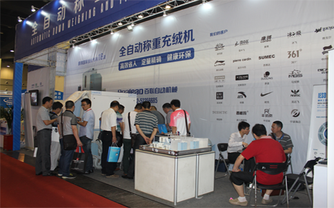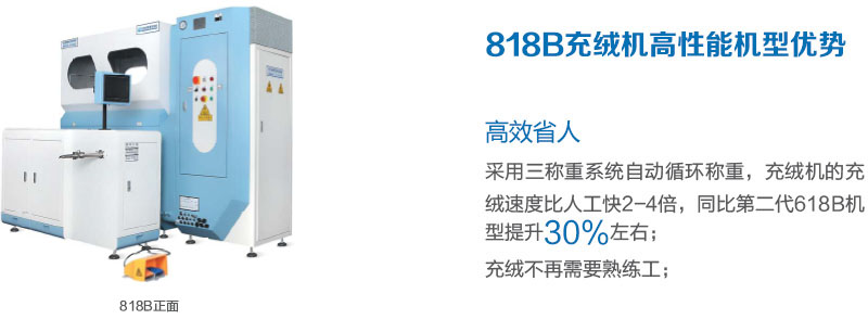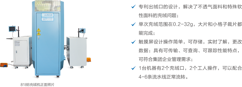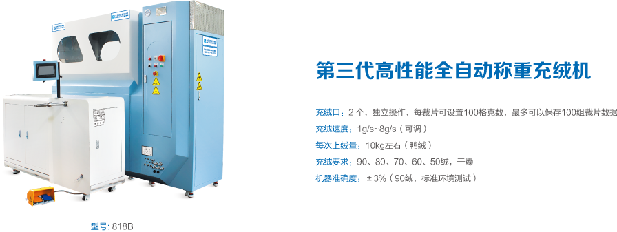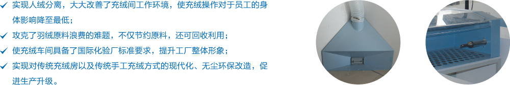 利用高壓氣體吸取羽絨,通過全自動稱重裝置,將設(shè)定克重的羽絨充入裁片。