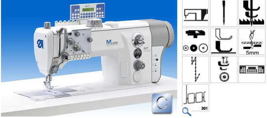The subclass 867-190125-M is equipped with a short thread trimmer with a remaining thread length of approx. 5 mm only. The thread clamping device guarantees a neat seam beginning and is offered as standard. This machine class can be optional equipped with a locking set for adjusting elements to increase the process reliability.